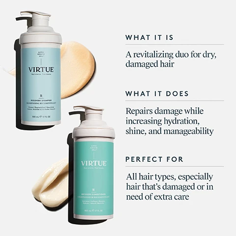 Packed with Alpha Keratin 60ku® power promises make way for the nourishment of the Virtue Recovery Shampoo and Conditioner Pro Sized Duo.